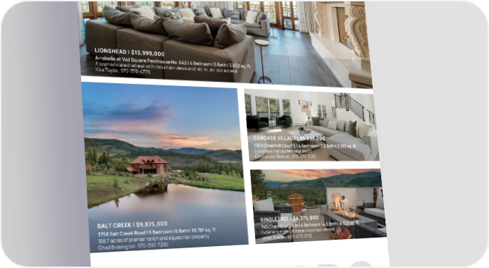 LIONSHEAD | $13,999,000 Arrabelle at Vail Square Penthouse No. 642 | 4 Bedroom | 5 Bath | 3,652 sq. ft. A sophisticated retreat with mountain views and ski-in, ski-out access Kira Taylor, 970-376-4779 CASCADE VILLAGE | $5,595,000 1359 Greenhill Court E | 4 Bedroom | 3.5 Bath | 3,189 sq. ft. Luxurious Vail duplex near ski lift Crystal Jay Seatvet, 970-376-6010 SALT CREEK | $9,875,000 SINGLETREE | $4,375,000 3758 Salt Creek Road | 6 Bedroom | 6 Bath | 10,781 sq. ft. 745 Charolais Circle | 4 Bedroom | 4.5 Bath | 4,520 sq. ft. 158.7 acres of premier ranch and equestrian property Experience the ultimate mountain retreat Chad Brasington, 970-390-7200 Janet Boeser, 970-470-2132 COLORADO
