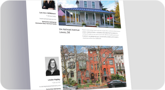 Lee Ann Wilkinson T: 302 645 6664 [email protected] Berkshire Hathaway HomeServices PenFed Realty 514 Railroad Avenue Classic sleek design meets upscale sought-after comforts in this Historic Lewes, DE Lewes 4-bedroom home—completely renovated from foundation to rooftop. Situated on an oversized lot with off-street parking and room to add a 2-car garage and pool. Conveniently located just minutes to downtown attractions. $1,650,000 Louise Kepley T: 571 419 1157 [email protected] Berkshire Hathaway HomeServices PenFed Realty 2023 Q Street NW Historic Grandeur in Dupont West. This 1890s mansion on 5 levels offers Washington, D.C. 6 bedrooms and 3.5 baths. The spectacular center staircase boasts a skylight and leads to the second level with formal dining and living rooms. Featuring gorgeous original details throughout. Located steps away from shopping, dining, and the metro. $2,500,000 22