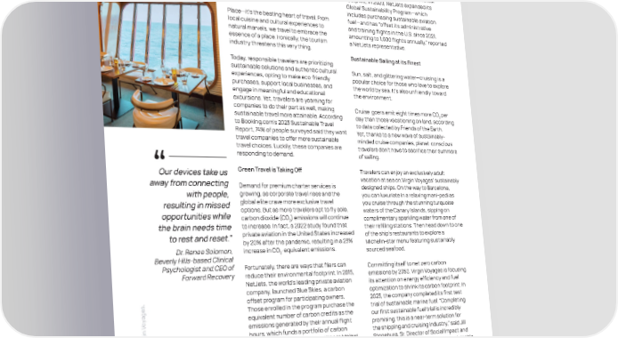 Thoughtful travelers are safety and service to owners and employees treading lightly on the must extend to the larger global community environment while still we impact as well,” said Brad Ferrell, Executive embracing the ultimate in Vice President of Administrative Services. Committed to reducing its environmental comfort and amenities. footprint, in 2020, NetJets expanded its Global Sustainability Program—which includes purchasing sustainable aviation Place—it’s the beating heart of travel. From fuel—and has “offset its administrative local cuisine and cultural experiences to and training flights in the U.S. since 2021, natural marvels, we travel to embrace the amounting to 1,600 flights annually,” reported essence of a place. Ironically, the tourism a NetJets representative. industry threatens this very thing. Sustainable Sailing at its Finest Today, responsible travelers are prioritizing sustainable solutions and authentic cultural Sun, salt, and glittering water—cruising is a experiences, opting to make eco-friendly popular choice for those who love to explore purchases, support local businesses, and the world by sea. It’s also unfriendly toward engage in meaningful and educational the environment. excursions. Yet, travelers are yearning for companies to do their part as well, making Cruise-goers emit eight times more CO per 2 sustainable travel more attainable. According day than those vacationing on land, according to Booking.com’s 2023 Sustainable Travel to data collected by Friends of the Earth. Report, 74% of people surveyed said they want Yet, thanks to a new wave of sustainably- travel companies to offer more sustainable minded cruise companies, planet-conscious travel choices. Luckily, these companies are travelers don’t have to sacrifice their summers responding to demand. of sailing. Our devices take us Green Travel is Taking Off Travelers can enjoy an exclusively adult away from connecting vacation at sea on Virgin Voyages’ sustainably Demand for premium charter services is designed ships. On the way to Barcelona, with people, growing, as corporate travel rises and the you can luxuriate in a relaxing mani-pedi as resulting in missed global elite crave more exclusive travel you cruise through the stunning turquoise opportunities while options. But as more travelers opt to fly solo, waters of the Canary Islands, sipping on carbon dioxide (CO ) emissions will continue complimentary sparkling water from one of 2 the brain needs time to increase. In fact, a 2022 study found that their refilling stations. Then head down to one to rest and reset.” private aviation in the United States increased of the ship’s restaurants to explore a by 20% after the pandemic, resulting in a 23% Michelin-star menu featuring sustainably Dr. Renee Solomon, increase in CO -equivalent emissions. sourced seafood. Beverly Hills-based Clinical 2 Psychologist and CEO of Fortunately, there are ways that fliers can Forward Recovery reduce their environmental footprint. In 2015, Committing itself to net zero carbon emissions by 2050, Virgin Voyages is focusing NetJets, the world’s leading private aviation its attention on energy efficiency and fuel . company, launched Blue Skies, a carbon optimization to shrink its carbon footprint. In s offset program for participating owners. e 2023, the company completed its first test g Those enrolled in the program purchase the trial of sustainable marine fuel. “Completing a y equivalent number of carbon credits as the o n V our first sustainable fuel trial is incredibly i emissions generated by their annual flight promising; this is a near-term solution for rg i hours, which funds a portfolio of carbon the shipping and cruising industry,” said Jill f V Left: projects, such as forest protection in Malawi Stoneburg, Sr. Director of Social Impact and y o The Scarlet Lady by s and solar power in India. Sustainability for Virgin Voyages. “Sustainable, e t Virgin Voyages. r bio-based fuels can work with our existing u o s c Right: “As the largest and most experienced engines today, and we could transition to o Fine dining on the Virgin company in the private aviation space these cleaner fuels now if they were more t o h Voyages’ Valiant Lady. worldwide, NetJets’ promise of exceptional readily available and affordable,” she added. P BERKSHIREHATHAWAYHS.COM 33