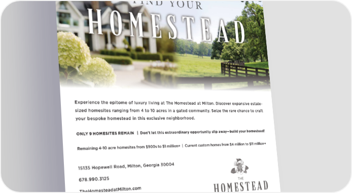 FIND YOUR Experience the epitome of luxury living at The Homestead at Milton. Discover expansive estate- sized homesites ranging from 4 to 10 acres in a gated community. Seize the rare chance to craft your bespoke homestead in this exclusive neighborhood. ONLY 9 HOMESITES REMAIN | Don’t let this extraordinary opportunity slip away—build your homestead! Remaining 4-10 acre homesites from $900s to $1 million+ | Current custom homes from $4 million to $11 million+ 15135 Hopewell Road, Milton, Georgia 30004 678.990.3125 TheHomesteadatMilton.com Follow us on social media: @thehomesteadatmilton ©2025 BHH Affiliates, LLC. An independently operated subsidiary of HomeServices of America, Inc., a Berkshire Hathaway affiliate, and a franchisee of BHH Affiliates, LLC. Berkshire HathawayHomeServices and the Berkshire Hathaway HomeServices symbol are registered service marks of Colum- bia Insurance Company, a Berkshire Hathaway affiliate. Information presented is deemed reliable, but is not warranted. If your property is currently listed, please disregard. It is not our intention to solicit properties that are already represented by another broker. Equal Housing Opportunity.