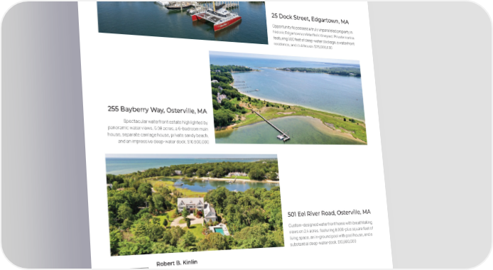 25 Dock Street, Edgartown, MA Opportunity to possess a truly unparalleled property in historic Edgartown on Martha’s Vineyard. Private marina featuring 500 feet of deep-water dockage, a waterfront residence, and clubhouse. $25,000,000 255 Bayberry Way, Osterville, MA Spectacular waterfront estate highlighted by panoramic water views, 5.98 acres, a 6-bedroom main house, separate carriage house, private sandy beach, and an impressive deep-water dock. $10,900,000 501 Eel River Road, Osterville, MA Custom-designed waterfront home with breathtaking views on 2.4 acres, featuring 8,000-plus square feet of living space, an in-ground pool with pool house, and a substantial deep-water dock. $10,500,000 Robert B. Kinlin Co-founder C: 508 648 2739 [email protected] robertkinlin.com Berkshire Hathaway HomeServices Robert Paul Properties 12