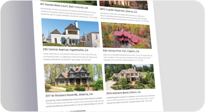 811 Hawks Nest Court, Ball Ground, GA 3875 Tuxedo Road NW, Atlanta, GA Extraordinary 20,000-plus-square-foot estate in Hawks Ridge Golf Course In prestigious Tuxedo Park, this estate offers discreet luxury and privacy. on 8 acres. European-inspired design with a private recording studio, 8 Set on Tuxedo Road between Blackland and King, it blends classic Georgian bedrooms, and 9 full and 3 half baths. $6,000,000. Todd Kroupa, 770 910 4860 exteriors with a refined, minimalist interior. $3,999,000. Jessica Li, 404 754 6555 230 Central Avenue, Fayetteville, GA 630 Hollow Pine Trail, Clayton, GA A rare custom-built luxury home in the Town of Trilith. One of only 2 by Wake up to stunning Blue Ridge Mountain views. This 6,700-square-foot log a renowned builder, in collaboration with architect Rudolfo Castro and cabin situated on 37 acres borders a national forest, offering end-of-the- designer Anna Booth. $3,990,000. Tonya Jones, 706 953 3268 road seclusion. $1,995,000. Andrea Sorgeloos, 404 729 9223 3117 W Roxboro Road NE, Atlanta, GA 3074 Watsons Bend, Milton, GA Enchanting modern masterpiece by renowned architect Jeffrey Bruce Baker. Exceptional golf course home in The Manor Golf & Country Club. Overlooking This Pine Hills gem exudes warmth, sophistication, and expansive glass as well the scenic 8th fairway, this luxury residence offers sophistication, comfort, as striking marble and stone accents. $3,295,000. Monica Parker, 301 706 2787 and a prime location. $2,950,000. The Butler Swayne Team, 770 241 9165 Berkshire Hathaway HomeServices Georgia Properties O: 678 352 3314 bhhsgeorgia.com 30