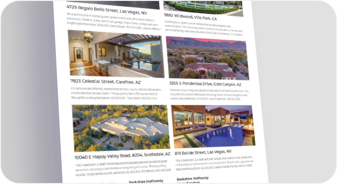 4729 Regalo Bello Street, Las Vegas, NV 9882 Wildwood, Villa Park, CA On a golf course in Siena’s guard-gated community, this home offers 2 A prestigious, gated custom estate that exudes elegance and bedrooms, 2 baths, a den, and 2-car garage. Enjoy views, a large yard and sophistication. This stunning home is nestled on a private cul-de-sac and bright open floor plan. $950,000. David Boyer, 702 379 6786, License #BS.67 set on sprawling, secluded grounds. $3,849,000. Erin Denes, 714 470 8254 7823 Celestial Street, Carefree, AZ 3205 S Ponderosa Drive, Gold Canyon, AZ A 5-acre estate offering unparalleled privacy, luxury, and southwestern- Discover luxury living at Supersition Mountain Golf and Country Club. This meets-Mediterranean charm. This property has 5,325 square feet of exquisite Arizona retreat boasts stunning views, timeless elegance, and thoughtfully designed space. $2,500,000. Tina Cobos, 602 363 4542 world-class amenities. $1,519,000. Laurel Robinson, 480 525 2203 10040 E Happy Valley Road, #204, Scottsdale, AZ 819 Bolide Street, Las Vegas, NV This 4-bedroom, 5-bath home has a stunning backyard and access to great This 3-bedroom, 2.5-bath and den, single-story home in the community amenities, including a Jack Nicklaus-designed golf course, 18-hole putting of Sandalwood in Summerlin, is model perfect. New builder upgrades are course, 13 clay tennis courts, and more. $2,400,000. Phil Mercrio, 602 430 3538 featured throughout. $2,365,000. Eleanor DeRain Horton, 661 547 8200 Berkshire Hathaway Berkshire Hathaway Berkshire Hathaway HomeServices HomeServices HomeServices Arizona Properties Nevada Properties California Properties bhhsaz.com bhhsnv.com bhhscaproperties.com 76