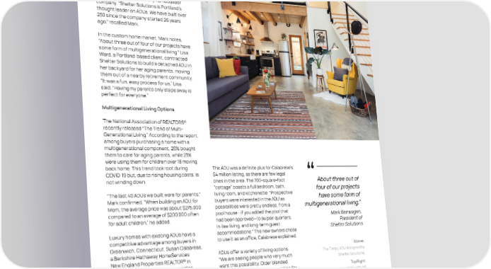 Mark Beirwagen, Michael’s brother, is the president of Shelter Solutions, Portland’s premier ADU builder based in Oregon City. Mark also owns Stone Creek Building, a Portland custom and luxury homebuilder company. “Shelter Solutions is Portland’s thought leader on ADUs. We have built over 250 since the company started 26 years ago,” recalled Mark. In the custom home market, Mark notes, “About three out of four of our projects have some form of multigenerational living.” Lisa Ward, a Portland-based client, contracted Shelter Solutions to build a detached ADU in her backyard for her aging parents, moving them out of a nearby retirement community. “It was a fun, easy process for us,” Lisa said. “Having my parents only steps away is perfect for everyone.” Multigenerational Living Options The National Association of REALTORS® recently released “The Trend of Multi- Generational Living.” According to the report, among buyers purchasing a home with a multigenerational component, 25% bought them to care for aging parents, while 21% were using them for children over 18 moving back home. This trend took root during The ADU was a definite plus for Calabrese’s COVID-19 but, due to rising housing costs, is $4 million listing, as there are few legal not winding down. ones in the area. The 700-square-foot About three out of “cottage” boasts a full bedroom, bath, four of our projects “The last 40 ADUs we built were for parents,” living room, and kitchenette. “Prospective Mark confirmed. “When building an ADU for buyers were interested in the ADU as have some form of Mom, the average price was about $275,000 possibilities were pretty endless, from a multigenerational living.” compared to an average of $200,000 often pool house—if you added the pool that Mark Beirwagen, for adult children,” he added. had been approved—to au pair quarters, President of in-law living, and long-term guest Shelter Solutions Luxury homes with existing ADUs have a accommodations.” The new owners chose competitive advantage among buyers in to use it as an office, Calabrese explained. Greenwich, Connecticut. Susan Calabrese, Above: a Berkshire Hathaway HomeServices ADUs offer a variety of living options. The Timby ADU designed by New England Properties REALTOR® in “We are seeing people who very much Shelter Solutions. Old Greenwich, sells luxury properties want this possibility. Older blended throughout this high-priced ZIP code. “I families find that an ADU is an option for Top Right: sold a home where an ADU was built on housing siblings to provide privacy for The Montgomery ADU with 481 the property when the main house was all,” Calabrese added. Another reason livable square feet. constructed in 2006. The intended purpose younger high-earning families like ADUs is Bottom Right: was for the grown son to live in it while he was that they offer a competitive edge when The kitchen space of Shelter between college and work,” said Calabrese. hiring live-in nannies. Solutions’ Shambry ADU. 4