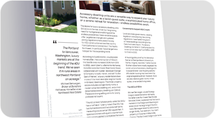 Accessory dwelling units are a versatile way to expand your luxury home, whether as a lavish guest suite, a sophisticated home office, or a serene retreat for relaxation—endless possibilities await. The desire for luxury accessory dwelling units Governments Support ADU Growth (ADUs) is on the rise, driven by the growing need for multigenerational living and the Local and state governments, creating endless possibilities these versatile spaces legislation and adopting new zoning offer. Legislative changes and updated regulations, have fueled the growth zoning regulations have paved the way of these dwellings. According to the for ADU construction across the country, Cato Institute’s report, “Accessory from California to Connecticut. The Pacific Dwelling Unit Reform,” California saw the The Portland Northwest, in particular, has emerged as a construction rate rise from 5,852 in 2019 to Vancouver, hotspot for this expanding trend. to 17,460 in 2022. ’ Washington, luxury ) According to BuildGreenNH, a sustainable A housing policy brief by the Mercatus e v o markets are at the homebuilder, the construction of ADUs in Center at George Mason University in b a beginning of the ADU the Seattle area increased 250% from 2019 Fairfax, Virginia, reported, “California and k ( c to 2022. Jason Liberty, a Berkshire Hathaway 13 other states have broadly legalized the o t trend. We’ve seen e S HomeServices Northwest Real Estate Broker, construction of accessory dwelling units b it in rural areas in collaborated with builder-developer Granger to expand lower-cost housing options.” o d northwest Portland & Company to build, market, and sell “Outlier Affordable housing may have been the , A a East of Market,” a luxury residential enclave original legislative driver; however, ADUs i i s on acreage.” a in one of the most desirable neighborhoods are also ideal as guest rooms, in-law t s a Michael Beirwagen, in Kirkland, Washington. The three-property suites, or extended living areas. n f A estate includes a single-family home, a Broker at Berkshire modern attached dwelling unit, and a third The ABCs of ADUs y o s Hathaway HomeServices e t detached accessory dwelling unit (DADU). r Northwest Real Estate . u ) These are strong selling points for young Michael Beirwagen, a Lake Oswego, o t h ’ cg i ) professional buyers. Oregon-based Berkshire Hathaway t r f k ( e HomeServices Northwest Real Estate l c k (o “The ADUs have full backyards, while the DADU Services Broker, explained that the luxury t c s o r t has a roof deck,” Liberty noted. One ADU has markets in the Oregon and Washington e Stt e two full bedrooms and two and a half baths, areas are at the beginning of the ADU b u Left: o h d measuring a substantial 1,321 square feet. A trend. Beirwagen recently sold a luxury Rustic ADU interior with , Aw S 5 spacious kitchen with quartz countertops single-family, five-bedroom, four-bath second floor loft. a fl o p e and custom cabinetry completes the luxury property on 12 acres in Wilsonville, h f pt Above: factor. Lofty ceilings and large windows Oregon. The Northwest lodge-style home ow y ol A small craftsman-style l s showcase light-filled spaces on two floors. An had an ADU nestled above the three-car e o t ADU perfect for guests. f F r open-concept living and dining area with a gas garage. “People here are often building u o y o Right: fireplace finishes the modern look and feel. them as custom guest houses,” added s o ce t t Spacious ADU with a view of The selling price of the ADU came in at $1.43 Beirwagen, whose own Lake Oswego o r h u o P c the main house. million. These are not your typical tiny homes. home boasts an ADU. BERKSHIREHATHAWAYHS.COM 3