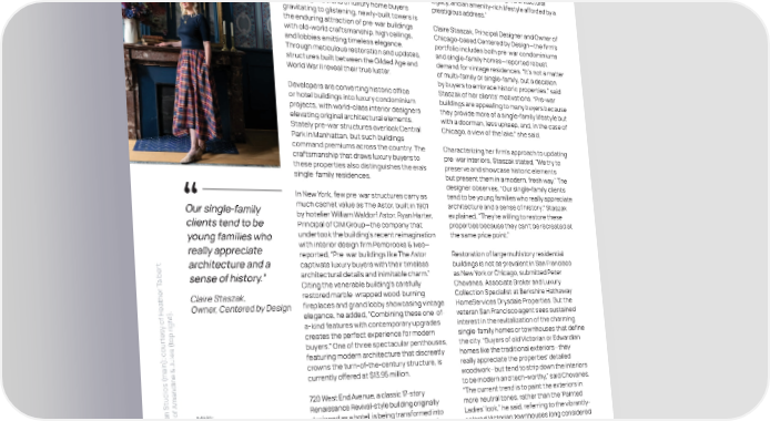 For some discerning buyers, a building constructed a grandeur with modern design innovation,” said Myles Horn, Managing Partner of Glacier Equities. century ago demands greater Insisting it represents a rare find in today’s market, consideration than the latest Horn said of prospective buyers, “While they supertall, contemporary tower. come from diverse backgrounds, they share an appreciation for elegant design, architectural legacy, and an amenity-rich lifestyle afforded by a Offsetting the trend of luxury home buyers prestigious address.” gravitating to glistening, newly-built towers is the enduring attraction of pre-war buildings Claire Staszak, Principal Designer and Owner of with old-world craftsmanship, high ceilings, Chicago-based Centered by Design—the firm’s and lobbies emitting timeless elegance. portfolio includes both pre-war condominiums Through meticulous restoration and updates, and single-family homes—reported robust structures built between the Gilded Age and demand for vintage residences. “It’s not a matter World War II reveal their true luster. of multi-family or single-family, but a decision by buyers to embrace historic properties,” said Developers are converting historic office Staszak of her clients’ motivations. “Pre-war or hotel buildings into luxury condominium buildings are appealing to many buyers because projects, with world-class interior designers they provide more of a single-family lifestyle but elevating original architectural elements. with a doorman, less upkeep, and, in the case of Stately pre-war structures overlook Central Chicago, a view of the lake,” she said. Park in Manhattan, but such buildings command premiums across the country. The Characterizing her firm’s approach to updating craftsmanship that draws luxury buyers to pre-war interiors, Staszak stated, “We try to these properties also distinguishes the era’s preserve and showcase historic elements single-family residences. but present them in a modern, fresh way.” The designer observes, “Our single-family clients In New York, few pre-war structures carry as tend to be young families who really appreciate Our single-family much cachet value as The Astor, built in 1901 architecture and a sense of history.” Staszak by hotelier William Waldorf Astor. Ryan Harter, explained, “They’re willing to restore these clients tend to be Principal of CIM Group—the company that properties because they can’t be recreated at young families who undertook the building’s recent reimagination the same price point.” really appreciate with interior design firm Pembrooke & Ives— t reported, “Pre-war buildings like The Astor Restoration of large multistory residential r architecture and a captivate luxury buyers with their timeless buildings is not as prevalent in San Francisco e b l a sense of history.” architectural details and inimitable charm.” as New York or Chicago, submitted Peter r T Citing the venerable building’s carefully Chovanes, Associate Broker and Luxury e h t Claire Staszak, restored marble-wrapped wood-burning Collection Specialist at Berkshire Hathaway a e fireplaces and grand lobby showcasing vintage HomeServices Drysdale Properties. But the . Owner, Centered by Design ) f Ht elegance, he added, “Combining these one-of- veteran San Francisco agent sees sustained h g y oi a-kind features with contemporary upgrades interest in the revitalization of the charming s e p r t r o creates the perfect experience for modern single-family homes or townhouses that define u t o s ( buyers.” One of three spectacular penthouses, the city. “Buyers of old Victorian or Edwardian e ; cl ) n u featuring modern architecture that discreetly homes like the traditional exteriors—they i a crowns the turn-of-the-century structure, is really appreciate the properties’ detailed m e & J n s (i currently offered at $13.95 million. woodwork—but tend to strip down the interiors o d i d n u a to be modern and tech-worthy,” said Chovanes. t m 720 West End Avenue, a classic 17-story “The current trend is to paint the exteriors in n Sf A a Renaissance Revival-style building originally more neutral tones, rather than the ‘Painted y y o Main: n s i e The Astor at 235 West 75th designed as a hotel, is being transformed into Ladies’ look,” he said, referring to the vibrantly- t f Br u Street, built in 1901. 131 luxury residences (available spring 2025), colored Victorian townhouses long considered y oo s ; c including a penthouse with sweeping Hudson a quintessential San Francisco aesthetic. e ) t t Bottom Left: r f River views priced at $11.6 million. “The thoughtful When these old homes are restored, maxing u e Interior design by Claire Staszak. o m l revival of Emery Roth’s 1927 design with out the allowable square footage and elevating o co t Top Right: o tt contemporary interiors by Thomas Juul-Hansen interiors, they appeal to well-heeled technology h o b Portrait of Claire Staszak. P ( creates a seamless integration of historical executives, reported Chovanes. BERKSHIREHATHAWAYHS.COM 75