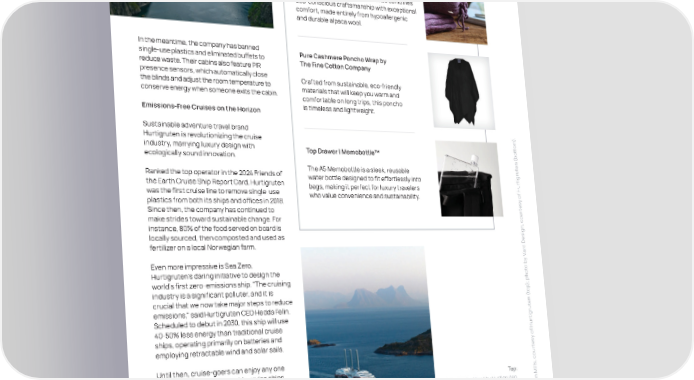 Sustainable Travel Take-Alongs The Alpaca Travel Shawl / Pillow Indigo by Samantha Holmes Alpaca A shawl/pillow by Samantha Holmes combines eco-conscious craftsmanship with exceptional comfort, made entirely from hypoallergenic and durable alpaca wool. In the meantime, the company has banned Pure Cashmere Poncho Wrap by single-use plastics and eliminated buffets to The Fine Cotton Company reduce waste. Their cabins also feature PIR presence sensors, which automatically close Crafted from sustainable, eco-friendly the blinds and adjust the room temperature to materials that will keep you warm and conserve energy when someone exits the cabin. comfortable on long trips, this poncho Emissions-Free Cruises on the Horizon is timeless and lightweight. . Sustainable adventure travel brand ) m Hurtigruten is revolutionizing the cruise o tt o industry, marrying luxury design with Top Drawer | Memobottle™ b ecologically sound innovation. n ( e t u The A5 Memobottle is a sleek, reusable r g Ranked the top operator in the 2024 Friends of i t water bottle designed to fit effortlessly into r u the Earth Cruise Ship Report Card, Hurtigruten bags, making it perfect for luxury travelers f H was the first cruise line to remove single-use who value convenience and sustainability. y o plastics from both its ships and offices in 2018. s e t r Since then, the company has continued to u o make strides toward sustainable change. For , c n instance, 80% of the food served on board is g i s locally sourced, then composted and used as e fertilizer on a local Norwegian farm. rd D a y V Even more impressive is Sea Zero, o b t Hurtigruten’s daring initiative to design the o h world’s first zero-emissions ship. “The cruising ; p ) p industry is a significant polluter, and it is o t crucial that we now take major steps to reduce n ( e emissions,” said Hurtigruten CEO Hedda Felin. t u r Scheduled to debut in 2030, this ship will use g i t r 40-50% less energy than traditional cruise u ships, operating primarily on batteries and f H y o employing retractable wind and solar sails. s e t r u Until then, cruise-goers can enjoy any one o , c of the company’s sustainable cruise ships. s l l Top: i Head to the sauna on the top deck of the The MS Trollfjord by Hurtigruten. n M MS Trollfjord to unwind as you admire the e breathtaking Norwegian fjords—or kick back Bottom: p with a glass of Havets Bobler, Hurtigruten’s Sea Zero ship by Hurtigruten. y Es o b t bespoke sea-aged sparkling wine, after an This is their first zero-emission o intriguing lecture from the Expedition Team. ship—ready to sail in 2030. h P 34
